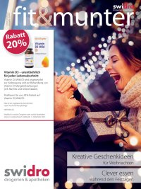 Vorschau auf die -Ausgabe 1/2022 Die nächste swidro Apotheke bereit. Es erwarten Sie wieder aktuelle Themen rund um Ihre Gesundheit und Schönheit sowie attraktive Spezialangebote und tolle Gewinnchancen. -Ausgabe liegt ab 14. Januar 2022 in Ihrer swidro Drogerie oder Themen dieser Ausgabe: Gesund & Vital • Sinusitis/Stirnhöhle • Trockene Haut • Vitalpilze Auflösung – Kreuzworträtsel 5/2021 Das richtige Lösungswort aus der -Ausgabe 5/2021 lautet: DAMPFBAD Ernährung • Babys – 1. Jahr Schönheit & Pflege • Naturkosmetik Mensch & Wissen • Lunge Eigenmarke • Psychische Gesundheit Der/die Gewinner*in des iPad Air inkl. Cover im Wert von CHF 884.– und die Gewinner*innen der 10x Originalpackungen IQ-Memory wurden schriftlich benachrichtigt. Impressum Herausgeber: swidro ag, Hinterbergstrasse 26, 6312 Steinhausen, Telefon 041 740 44 50, www.swidro.ch Redaktionsteam: Bernet Thomas, Boog Miriam, Burch Alice, Henzi Carina, Langenegger Marc, Stocklin Katja, Windlin Manuela Layout | Design: otcmarketing GmbH, Riedstrasse 1, 6330 Cham, www.otcmarketing.ch Inserateannahme: swidro ag, 6312 Steinhausen, fitundmunter@swidro.ch Druck: Druckerei Kyburz AG, 8157 Dielsdorf Auflage: 291’344 Exemplare Drogerien und Apotheken finden Sie an folgenden Standorten: Aargau Gesundheit im Zentrum, Aarau | Vita Drogerie, Baden | swidro drogerie bremgarten, Bremgarten | Drogerie Venzin, Möhlin | swidro drogerie russi, Würenlos | Drogerie Unterstadt, Zofingen Appenzell A.Rh. Drogerie Bohl, Heiden | Drogerie Walhalla, Herisau | Vital Drogerie, Teufen Basel-Land Ergolz-Drogerie, Lausen | Drogerie Schläpfer, Oberwil | Drogerie Heiniger, Reigoldswil | Dorf-Drogerie Eichenberger, Therwil Basel-Stadt Drogerie Hildebrand, Basel Bern Wildstrubel-Drogerie, Adelboden | swidro drogerie elmer, Bätterkinden | Drogerie Studer, Bremgarten | Apotheke-Drogerie am Marktplatz, Büren a.A. | Stöckli-Drogerie, Eggiwil | Drogerie Studer, Fraubrunnen | Holzgang, Grindelwald | Drogerie Chartreuse, Hünibach | Drogerie Egger, Koppigen | Naturdrogerie Langnau, Langnau i.E. | Drogerie Wittwer, Madiswil | Drogerie Studer, Münchenbuchsee | swidro drogerie nidau, Nidau | Schlossdrogerie Jutzi, Oberhofen | Drogerie von Känel, Reichenbach | Natur Drogerie Emmen- tal, Rüegsauschachen | swidro drogerie hüttinger, Schwarzenburg | Drogerie Krebser, Sumiswald | swidro drogerie täuffelen, Täuffelen | Drogerie Krebser, Wasen | Drogerie Wyss, Zollbrück Glarus Drogerie Brunner, Näfels Graubünden Drogerie-Apotheke Lacuna, Chur | Drogerie am Martinsplatz, Chur | Gesundheits Drogerie Zier, Davos Dorf | swidro drogaria alpina, Ilanz | Drogaria Zysset, Samedan | Drogaria Mosca, Scuol Luzern swidro apotheke drogerie st. michael, Beromünster | Drogerie Schlumpf, Dagmersellen | Apotheke Fanghöfli, Luzern-Littau | swidro drogerie wäsmeli, Luzern | Drogerie Würzenbach, Luzern | swidro naturdrogerie rothenburg, Rothenburg | Rottal Drogerie, Ruswil | swidro drogerie schmidlin, Schüpfheim | Städtli Drogerie, Willisau | märtgass Drogerie, Zell Obwalden Allmend Drogerie, Alpnach Dorf | Drogerie Sachseln, Sachseln | Drogerie Bühlmann, Sarnen Schwyz Drogerie Gwerder, Muotathal St. Gallen Kressig Drogerie, Bad Ragaz | swidro drogerie räfis, Buchs-Räfis | swidro drogerie buchs, Buchs | Toggenburg Drogerie, Ebnat-Kappel | Drogerie Bohl, Flawil | Drogerie Schläpfer, Goldach | swidro drogerie grabs, Grabs | Drogerie Brunner, Kaltbrunn | swidro drogerie oberuzwil, Oberuzwil | Drogerie Brunner, Schmerikon | Falken-Drogerie, St. Gallen | swidro apotheke drogerie walenstadt, Walenstadt | Oedenhof-Drogerie, Wittenbach Thurgau Bahnhof-Drogerie, Amriswil | swidro drogerie rosengarten, Arbon | Drogerie Wyss, Frauenfeld | Drogerie Brunnschweiler, Steckborn | swidro drogerie sulgen, Sulgen | Apotheke-Drogerie Aemisegger, Weinfelden Uri Dorf Drogerie Ettlin, Erstfeld Zug Drogerie Hermann, Menzingen | Apotheke Arkadenhof, Rotkreuz | Drogerie Schilliger, Rotkreuz | Drogerie Hermann, Unterägeri Zürich Dorf-Drogerie Hafen, Bassersdorf | Drogerie Treib, Birmensdorf | Dorf-Drogerie Hafen, Dietlikon | vitalxund drogerie, Elgg | Center-Drogerie, Embrach | Dorf-Drogerie, Embrach | Drogerie Tschofen, Fehraltorf | Drogerie Kasser, Turbenthal | Drogerie Tschofen, Wetzikon | NaturSpross Drogerie, Wiesendangen Fürstentum Liechtenstein Centrum Drogerie, Eschen